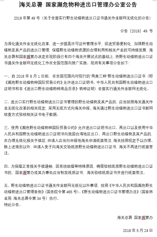 海關(guān)總署國(guó)家瀕危物種進(jìn)出口管理辦公室公告2018年第49號(hào)(關(guān)于全面實(shí)行野生動(dòng)植物進(jìn)出口證書通關(guān)作業(yè)聯(lián)網(wǎng)無紙化的公告)